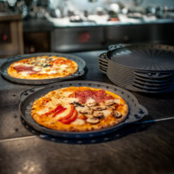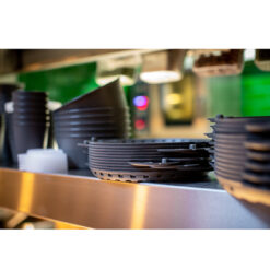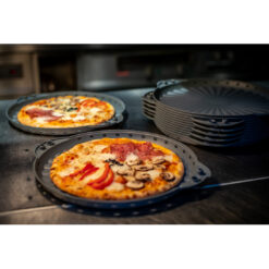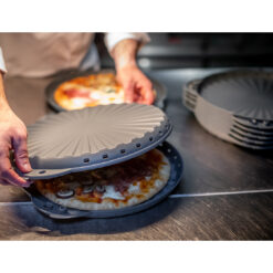 - Die ultimative Transportbox für Pizzen – die sich auch perfekt zum Servieren eignet. Boden und Deckel sind identisch und passen auf Umschlag. Beide Teile werden ganz einfach durch die intelligent konstruierten Griffschalen miteinander fixiert. Eine zusätzliche Verriegelung ist nicht notwendig, was ein einfaches Handling garantiert. Die gestufte Struktur der Oberfläche verleiht der Box eine hohe Stabilität, bietet eine sehr gute Fixierung beim Stapeln und verhindert ein Anhaften der Pizza. Die strahlenförmige Anordnung der Stufen zur Mitte hin entspricht der Schnittrichtung und bietet Orientierung beim Zerteilen. Durch die seitlichen Lüftungsöffnungen kann überschüssige Feuchtigkeit entweichen und die Pizza bleibt schön kross. Diese sehr robuste und langlebige Pizzabox ist in zwei Größen erhältlich und eignet sich perfekt für den Einsatz in der Gastronomie bzw. in Pfandsystemen und spart viele hundert Einwegkartons.